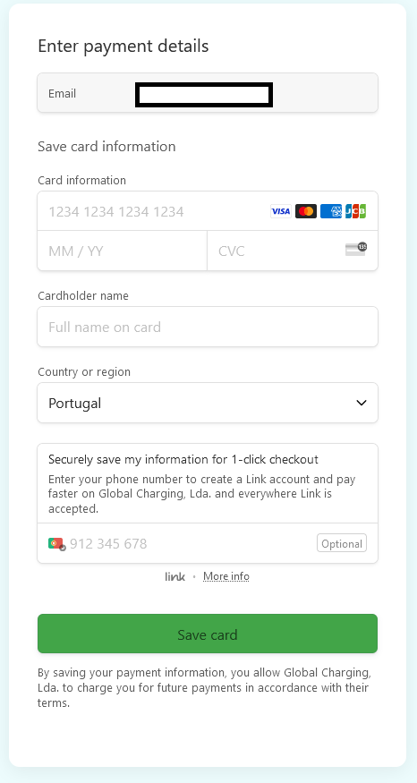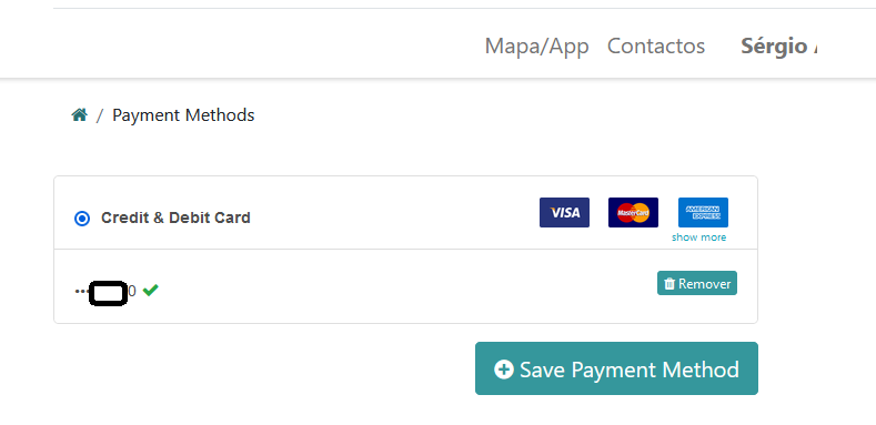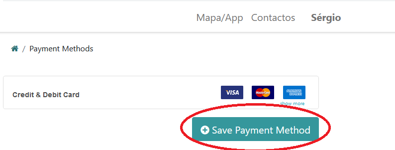 Na primeira vez tem de inserir um novo clicando em + Save Payment Method